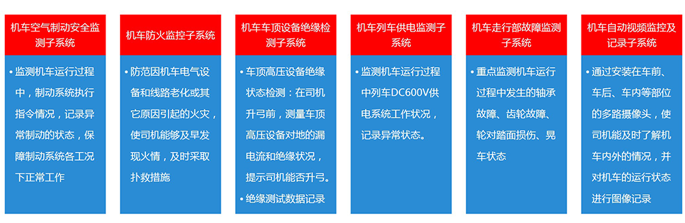 6A系統(tǒng)利用智能傳感技術(shù)、通信技術(shù)和信息融合技術(shù),對機車進行動態(tài)監(jiān)測,數(shù)據(jù)集中,信息共享,綜合分析,提前預(yù)警。為機車在途運行提供安全監(jiān)控,為機車地面檢修提供安全防范支持,以加強機車運用安全的技防和機防能力。