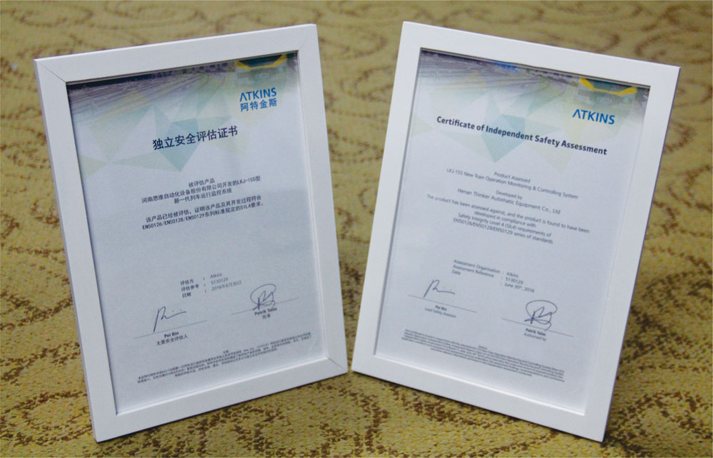 公司“LKJ-15S型”新一代監控系統喜獲SIL4安全評估證書