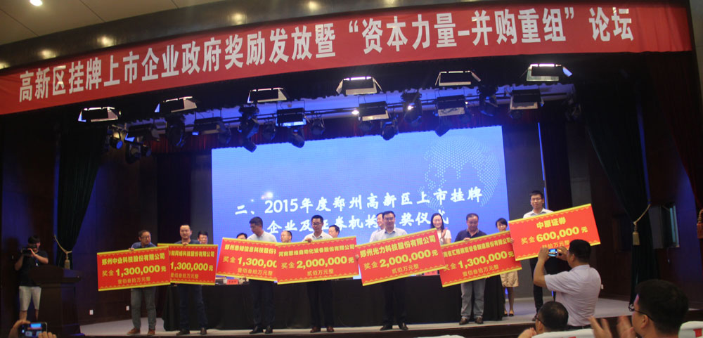 7月12日,鄭州高新區管委會掛牌上市企業政府獎勵發放暨“資本力量-并購重組”論壇在高新區管委會二樓報告廳盛大舉行,河南思維自動化設備股份有限公司作為2015年上海證券交易所A股掛牌上市企業,獲得了高新區管委會上市獎勵200萬元,思維股份總經理方偉代表公司上臺領獎。