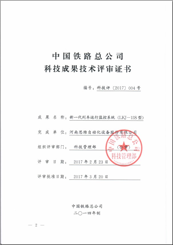 3月20日,中國鐵路總公司科技管理部下發了《中國鐵路總公司科技管理部關于印發河南思維自動化設備股份有限公司<新一代列車運行監控系統(LKJ-15S型)>通過技術評審的通知》(科技運函[2017]22號),并頒發了科技成果技術評審證書(編號:科技評[2017]004號),標志著公司新一代LKJ正式通過了技術評審。