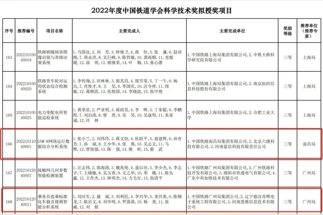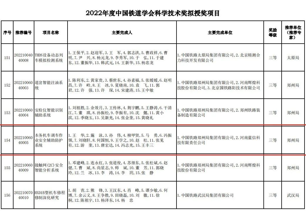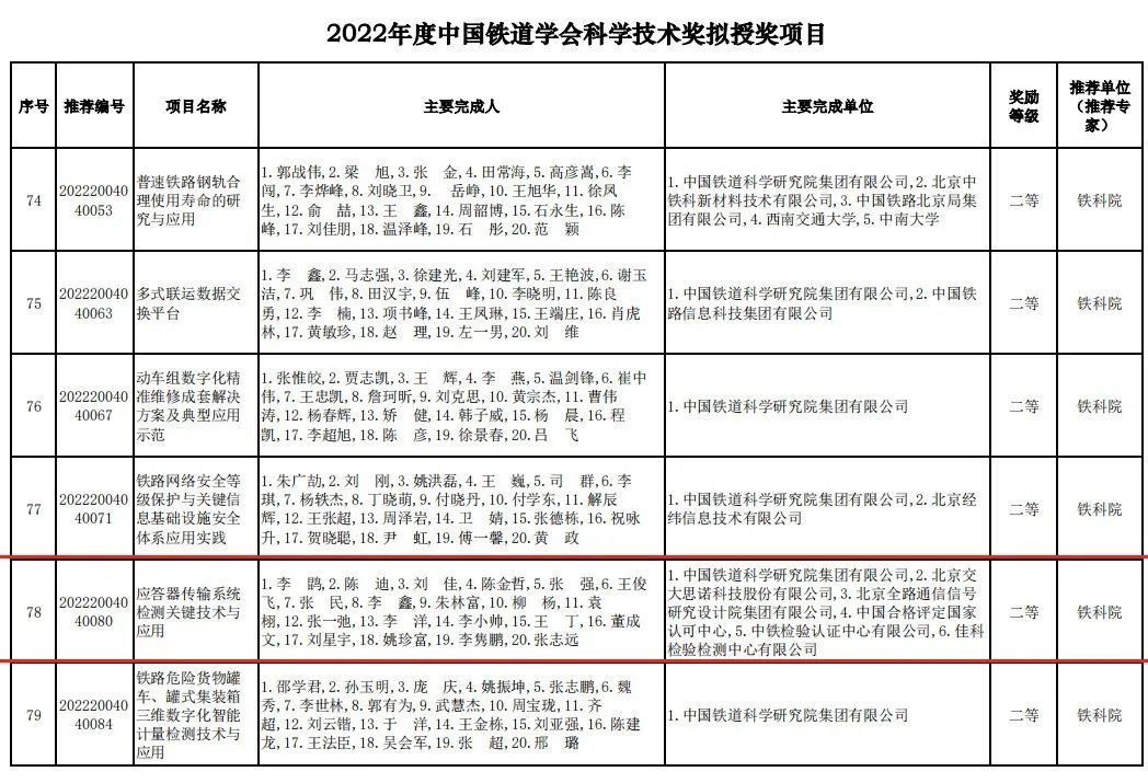 2022年12月30日,中國鐵道學會組織中國工程院院士、行業(yè)科技權威組成的評審委員會審議2022年度中國鐵道學會科學技術獎網(wǎng)絡推薦申報項目,最終確定擬向275項優(yōu)秀鐵路科技成果頒發(fā)“2022年度中國鐵道學會科學技術獎”,特等獎8項、一等獎39項、二等獎90項、三等獎138項。