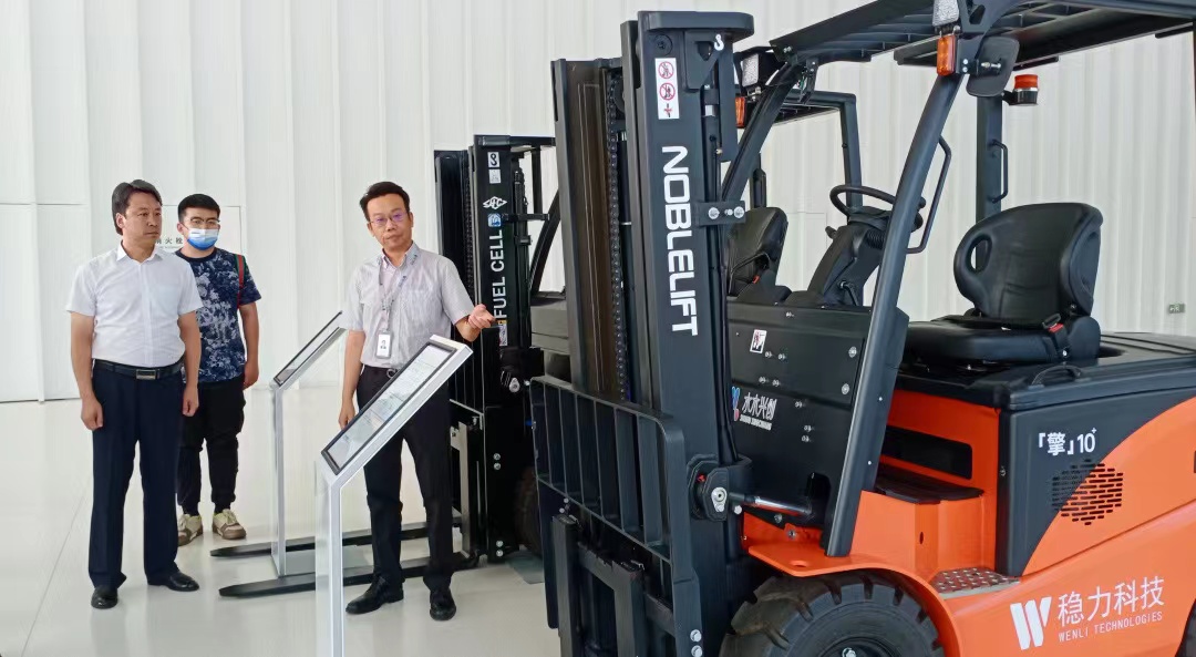 招商考察期間,于久彥書記一行首先參觀了氫能交流中心,在展覽區跟隨講解員詳細參觀了解——氫能制、儲、運、加、用、燃料電池八大核心及其他零部件等國內外先進的技術成果。在核心展區,吳偉向考察團一行介紹了正在展出的北京穩力自主研發的燃料電池叉車「擎」10+。于久彥書記對該叉車的“零污染、零排放”、“加氫3分鐘、工作6小時”等綠色清潔動力優勢給予了認可。